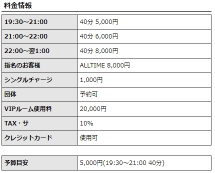 (料金)19:30〜21:00 40分 5000円、21:00〜22:00 40分 6000円、2:00〜翌1:00 40分 8000円(指名は常時8000円)